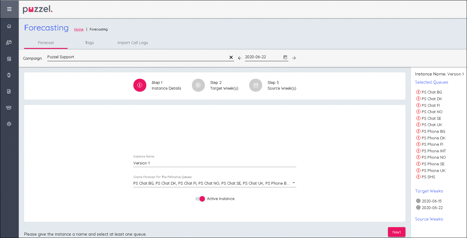 - Skapa version från följande köer: Här väljer du vilka köer du vill inkludera i din Forecast. Som standard markeras alla associerade köer med kampanjen.
