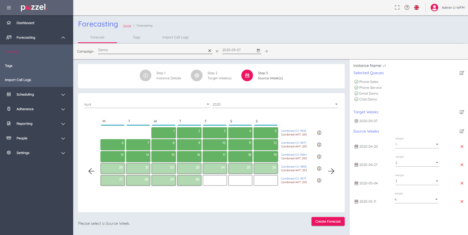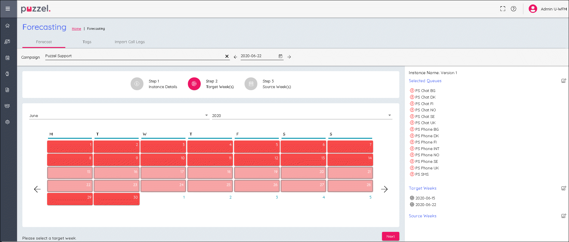 - Veckor med historiska data blir gröna. Det kommer också att finnas en sammanfattning av kontaktvolymen och AHT för veckan till höger om kalendern.
